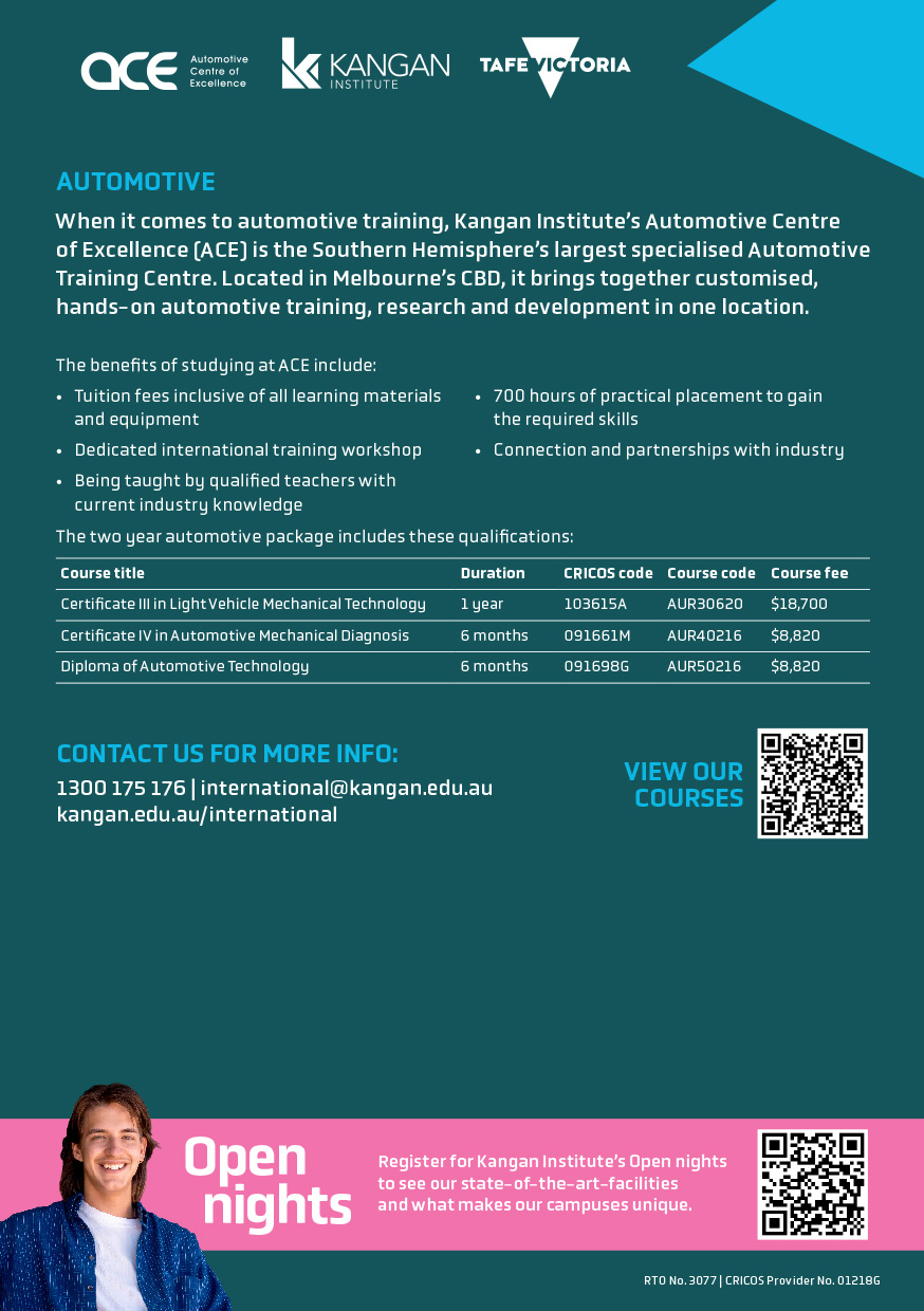 เมื่อพูดถึงการฝึกอบรมด้านยานยนต์ ศูนย์ความเป็นเลิศด้านยานยนต์ (ACE) ของสถาบันคังกัน คือศูนย์ฝึกอบรมยานยนต์เฉพาะทางที่ใหญ่ที่สุดในซีกโลกใต้ ตั้งอยู่ในใจกลางเมืองเมลเบิร์น ที่นี่รวบรวมการฝึกอบรมด้านยานยนต์แบบลงมือปฏิบัติจริง การวิจัย และการพัฒนาไว้ในที่เดียว