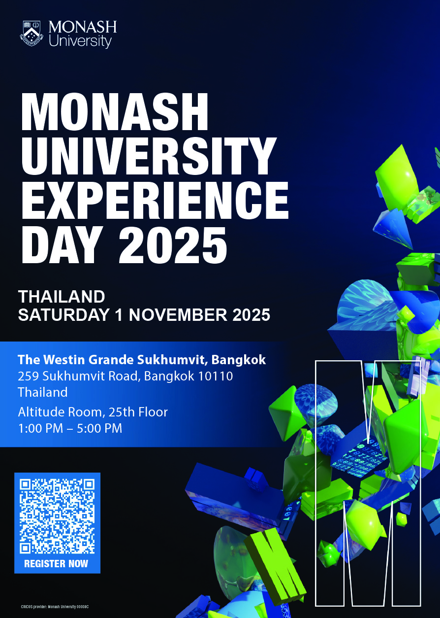 ขอเชิญร่วมงาน Monash University Experience Day 2025 ซึ่งจัดโดยมหาวิทยาลัย Monash กิจกรรมนี้เป็นโอกาสอันดีที่จะได้เรียนรู้เพิ่มเติมเกี่ยวกับ Monash และสำรวจทางเลือกในการศึกษา