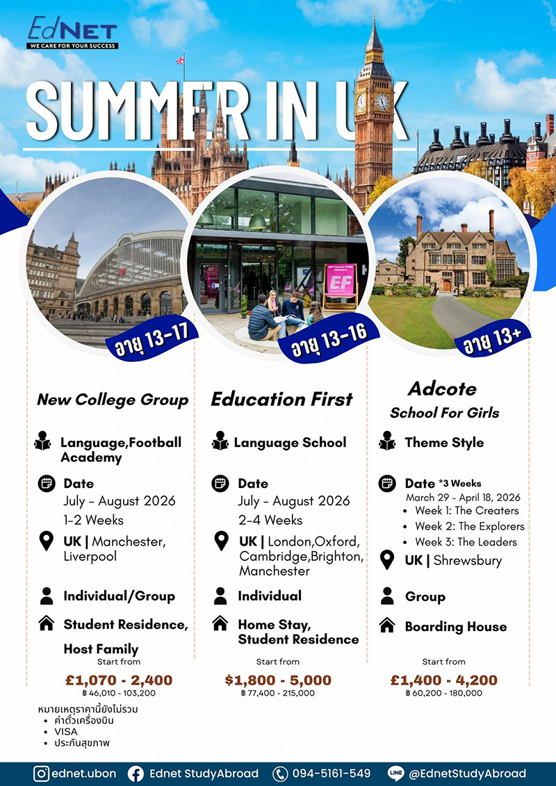 เปิดประสบการณ์ SUMMER ใน UK สำหรับน้อง ๆ อายุ 13–17 ปี ที่ต้องการพัฒนาทักษะภาษาอังกฤษในสภาพแวดล้อมจริง พร้อมกิจกรรมสนุกหลากหลาย โปรแกรมนี้เรียนร่วมกับเพื่อนต่างชาติ ทำให้เด็ก ๆ ได้ฝึกการสื่อสารอย่างเป็นธรรมชาติ กล้าพูดมากขึ้น และเกิดความมั่นใจในการใช้ภาษาในชีวิตประจำวัน